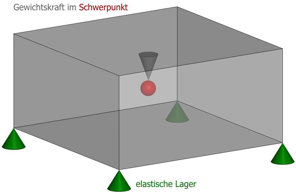 Es setzt voraus, dass sich die Gewichtskraft des Gerätes auf alle Lager in etwa gleich verteilt. Die Dämpfer sind symmetrisch zum Gesamtschwerpunkt angebracht. Die schwingungstechnische Anregung erfolgt durch eine drehende Unwucht.