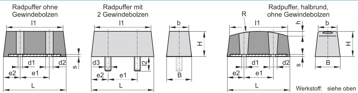 Radpuffer sind in unterschiedlichen Ausführungen und geometrischen Größen verfügbar. Sie bestehen aus Metallen unterschiedlicher Ausführung und einem vulkanisierten Gummi.